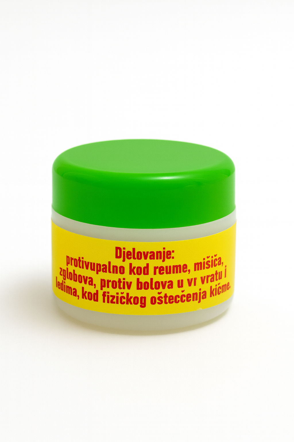 Natural healing balm with active herbal ingredients: arnica oil, peppermint oil, clove oil, camphor oil and chili pepper essential oil (capsaicin). Designed for external use, it relieves muscle and joint pain and helps with rheumatism and physical strain.